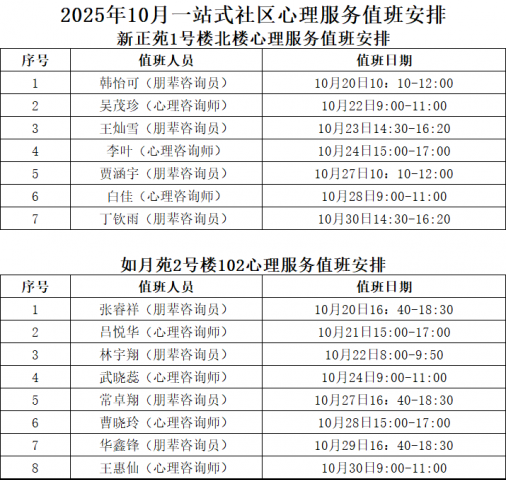 2025年10月“一站式”学生社区心理咨询服务值班安排表