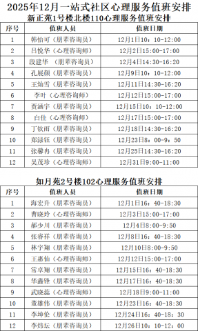 2025年12月“一站式”学生社区心理咨询服务值班安排表